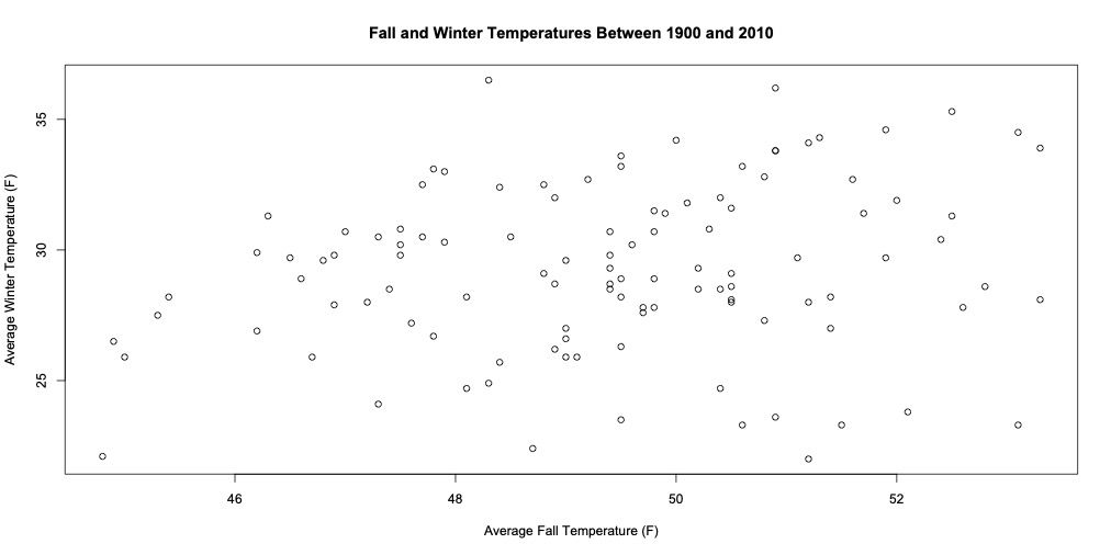 With those things out of the way I began reviewing my notes from the previous semester and came upon an interesting set of data. Below is a graph of average fall and winter temperatures in Fort Collins, CO between 1900 and 2010.