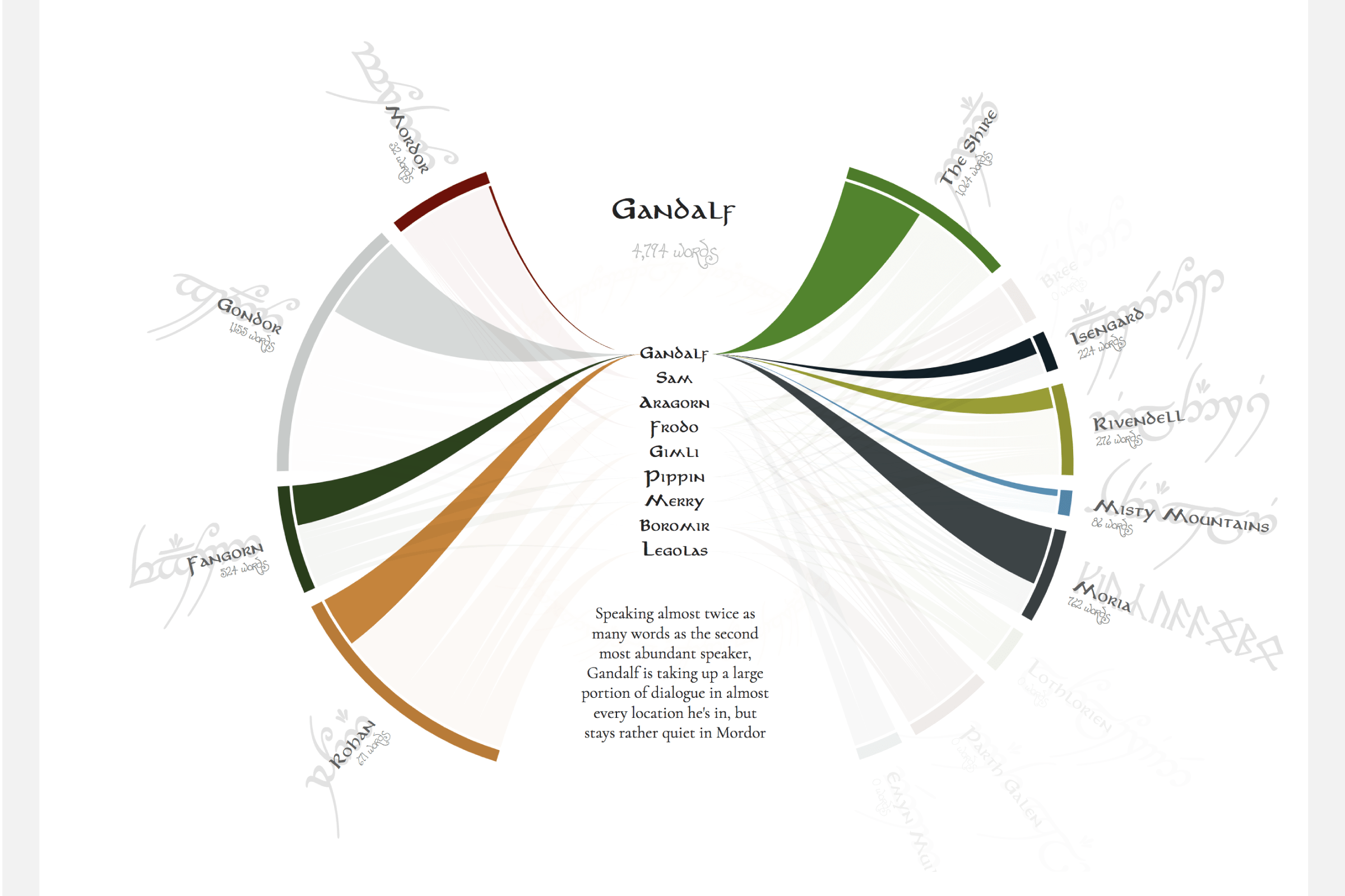 This section also has what is probably my favorite graph in the entire book: A chord diagram showing how much characters have spoken in Lord of the Rings, created by Nadieh Bremer.